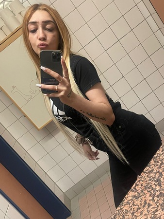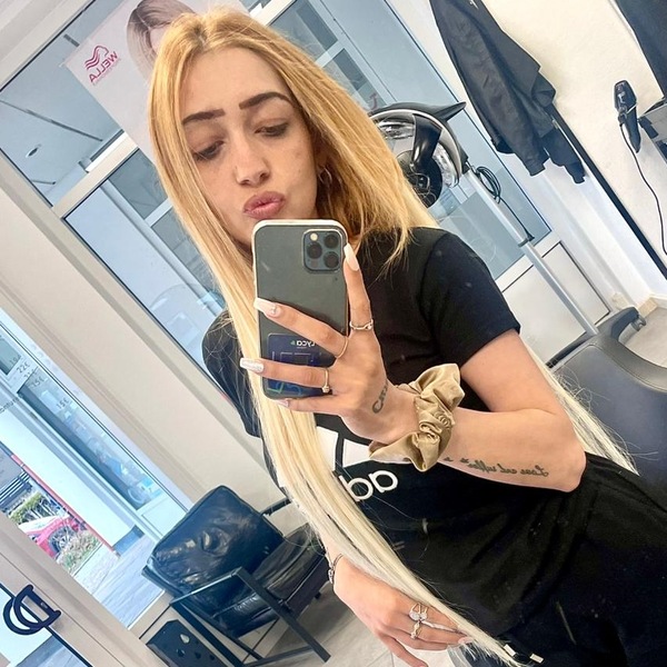 Haare:blond, rückenlang
